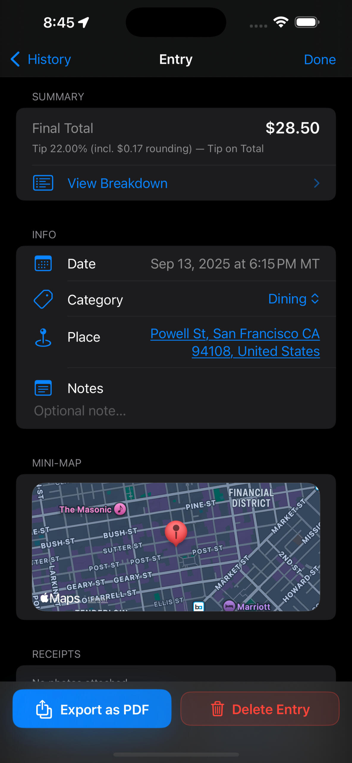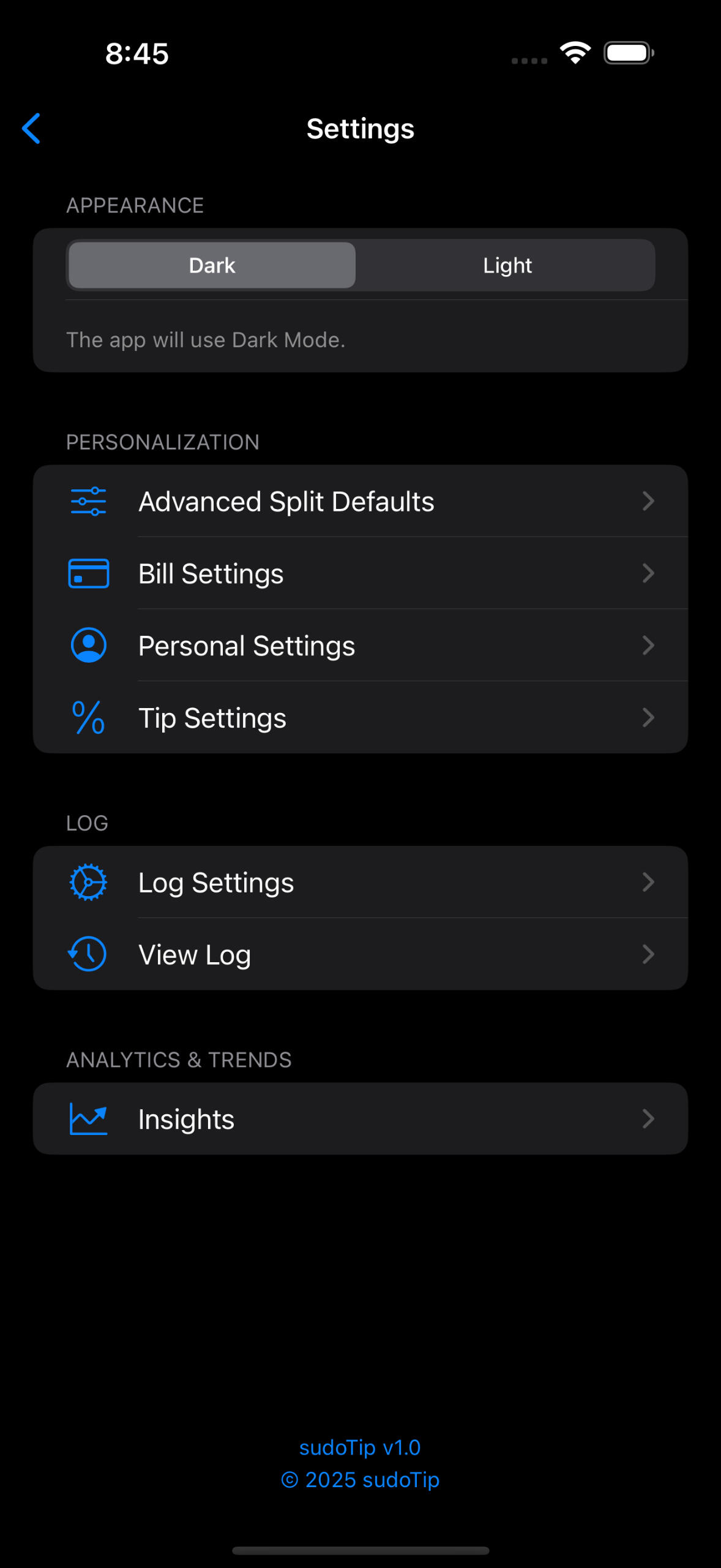 All content you create in the app—saved entries, places, receipt photos, and PDFs—stays locally on your device.If your device uses iCloud (or another system backup), an encrypted copy of app data may be included in your device backups. That is controlled by your OS settings.Optional permissions (you’re in control)sudoTip asks for access only when you use a related feature. You can change permissions anytime in iOS Settings → Privacy & Security.Location (While Using the App): Used to prefill the “Place” field when saving an entry. Not required; you can enter the place manually. We do not track or store a location history.Camera: Used to take receipt photos to attach to entries. Photos are stored on your device.Photos (Library): Used to select existing receipt images. Read-only access; images remain on your device.Notifications, Contacts, Microphone: Not used.How your data is usedAll calculations (tips, splits, rounding, expense mode) run on device.Saved entries (totals, per-person amounts, extras), places, and receipt photos remain local unless you choose to share or export.When you use the system Share Sheet or PDF export, you pick the destination (e.g., Messages, Mail, Files). At that point, the destination app/service’s privacy policy applies.Third-party servicesWe do not use analytics SDKs, ad trackers, or external databases.If you’ve opted in at the OS level to share diagnostics with developers, Apple may send us aggregated crash logs. These do not include personally identifying information and are used only to improve stability.Data retention & deletionYour data stays on your device until you delete it.You can delete individual entries (and attached receipts) from the app’s history.You can remove all app data by deleting the app. (Backups you control—like iCloud device backups—may retain encrypted copies until those backups are replaced or deleted.)SecurityWe rely on iOS security features and local device protections. Because we don’t transmit data to our servers, there is no server-side storage to secure.Children’s privacysudoTip is a general-audience app and does not collect personal data from anyone, including children. If a child shares information via export to another app or service, that provider’s policy applies.International users & rightsBecause we don’t collect or store data off-device, most privacy rights (access, correction, deletion, portability) can be exercised directly on your device. If you need help, contact us and we’ll assist.Changes to this policyIf we make material changes, we’ll update this page and the “Last updated” date.